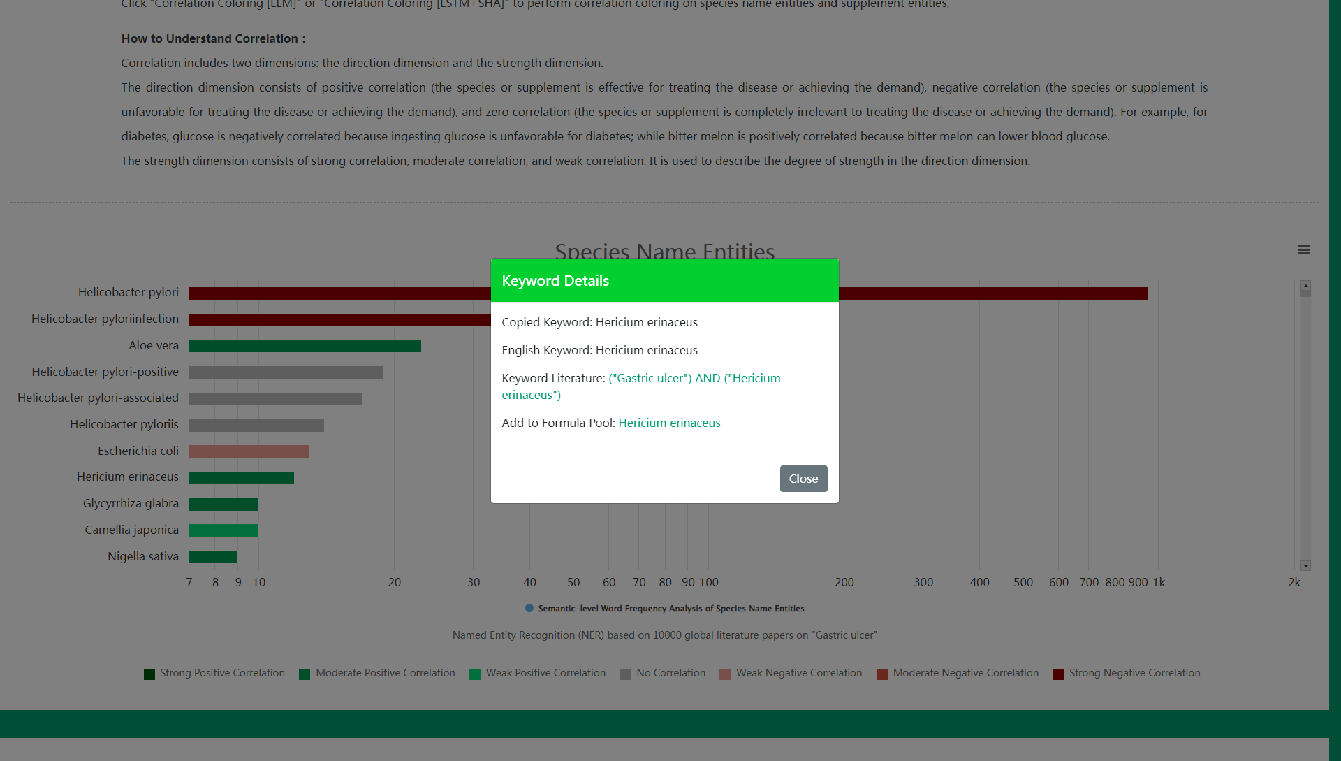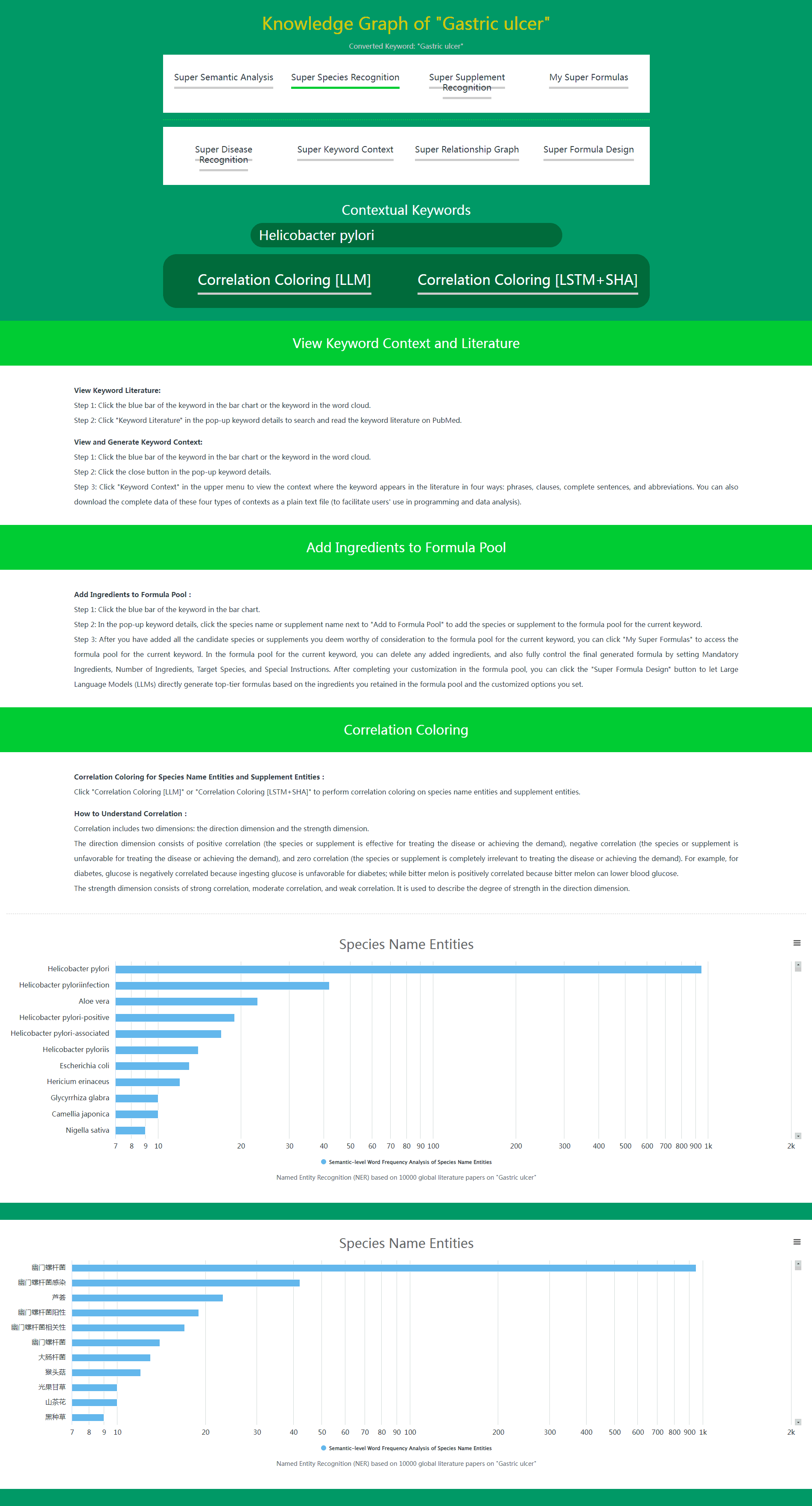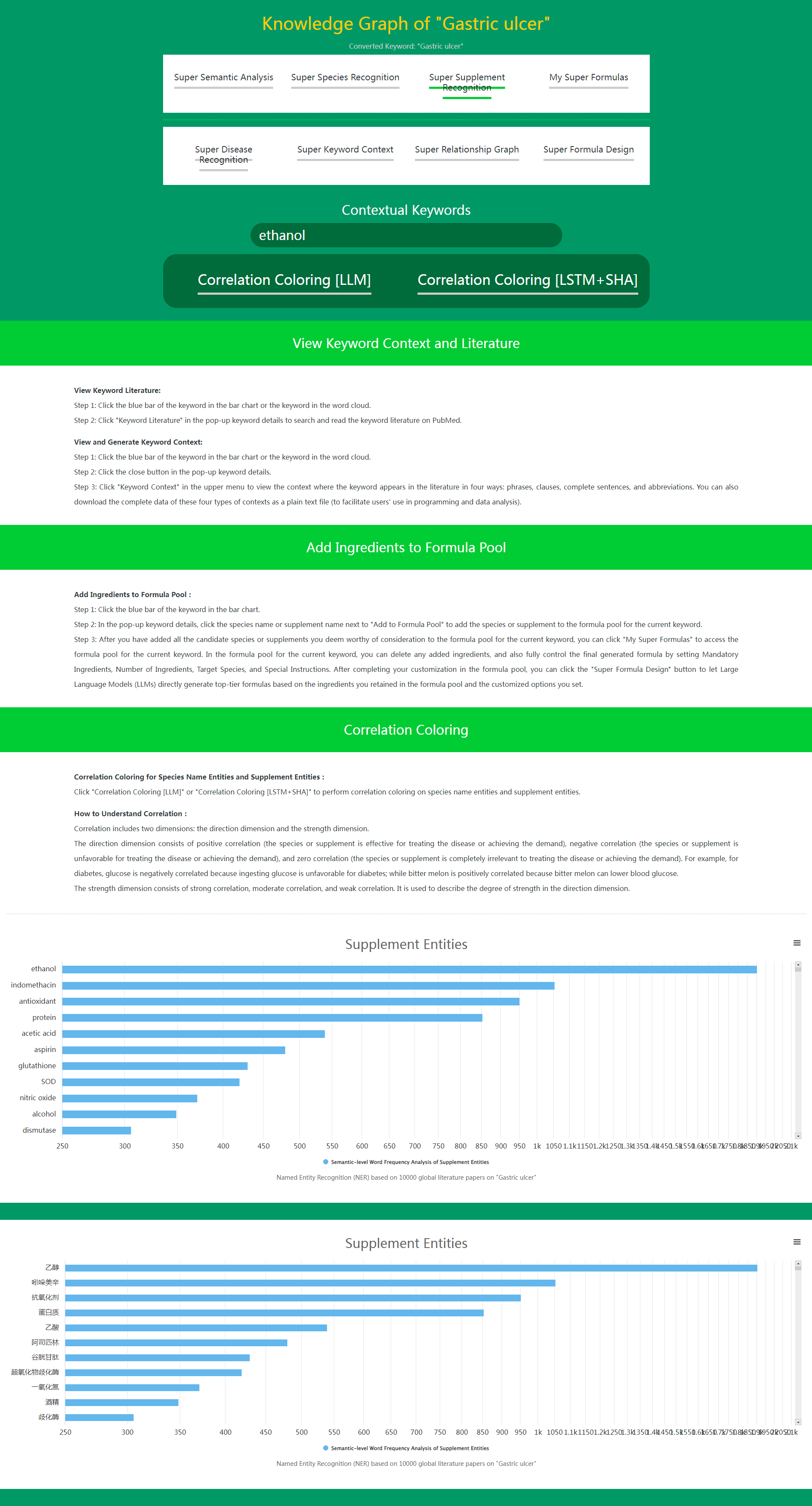 After completing species identification for all batches, click Supplements for each batch sequentially. This will extract all supplements closely associated with gastric ulcer identified from the 2,000 literature entries in each batch, and sort them by Semantic-level Word Frequency Value.