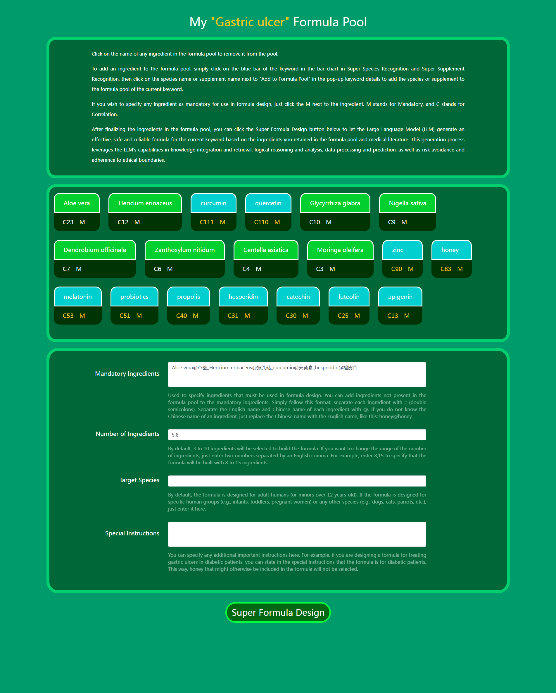 Your customized Formula Pool for gastric ulcer will display all added candidate species and supplements, with species marked in green and supplements marked in blue.
