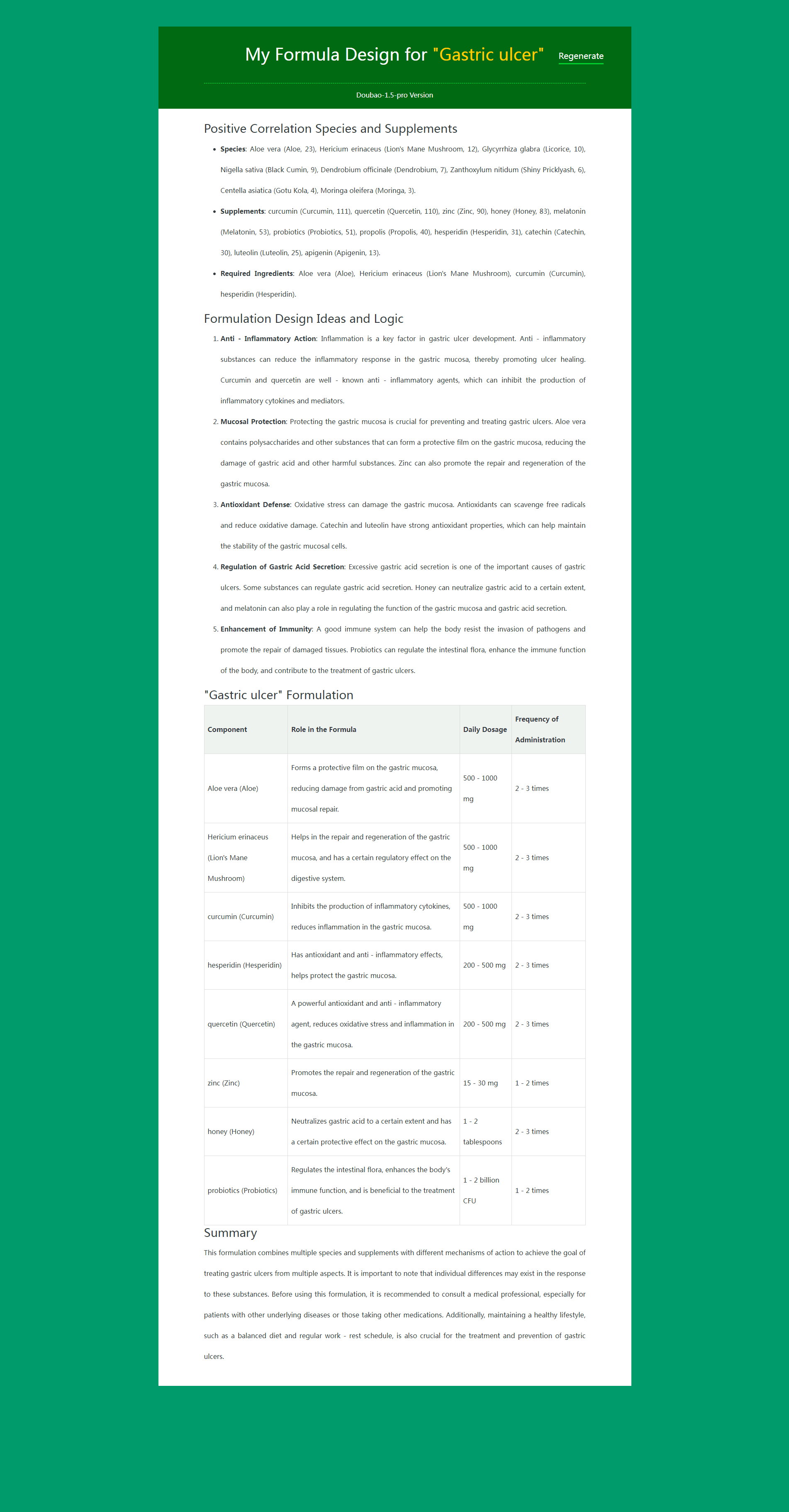 Some people might say, "Large language models are extremely powerful these days—can’t I just have one design a formula for gastric ulcers for me?" Of course you can. You can use various large language models (including ChatGPT, Gemini, DeepSeek, Doubao, and others) and try different prompts to generate dietary supplement formulas targeting gastric ulcers.